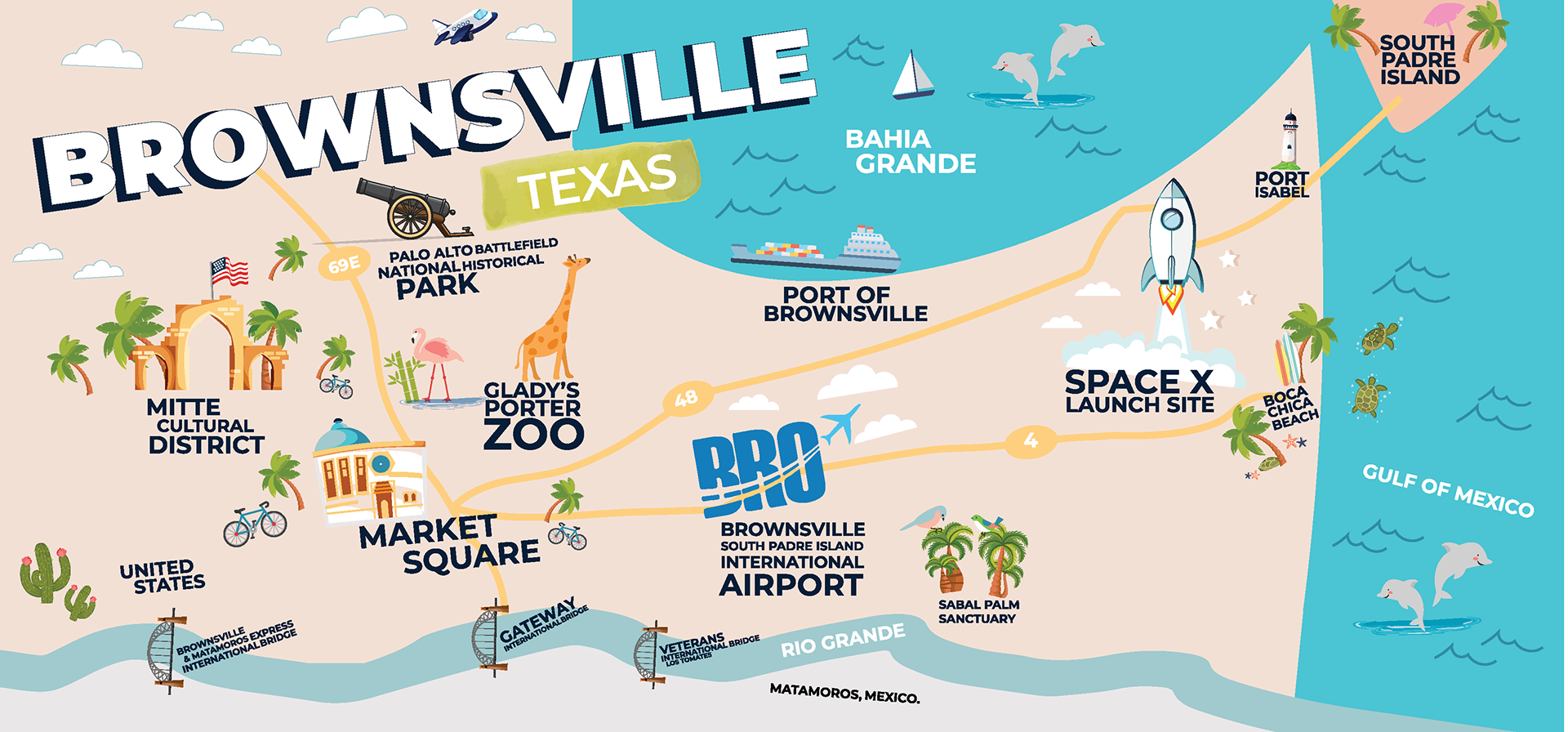 Commissioned by the City of Brownsville Tourism Marketing Department, this project transforms the airport into an immersive introduction to place through a pair of large-scale illustrated map murals at Brownsville/South Padre Island International Airport. The murals use bold color, playful iconography, and simplified geography to create an approachable, human-centered wayfinding experience that orients travelers while sparking curiosity about the region.