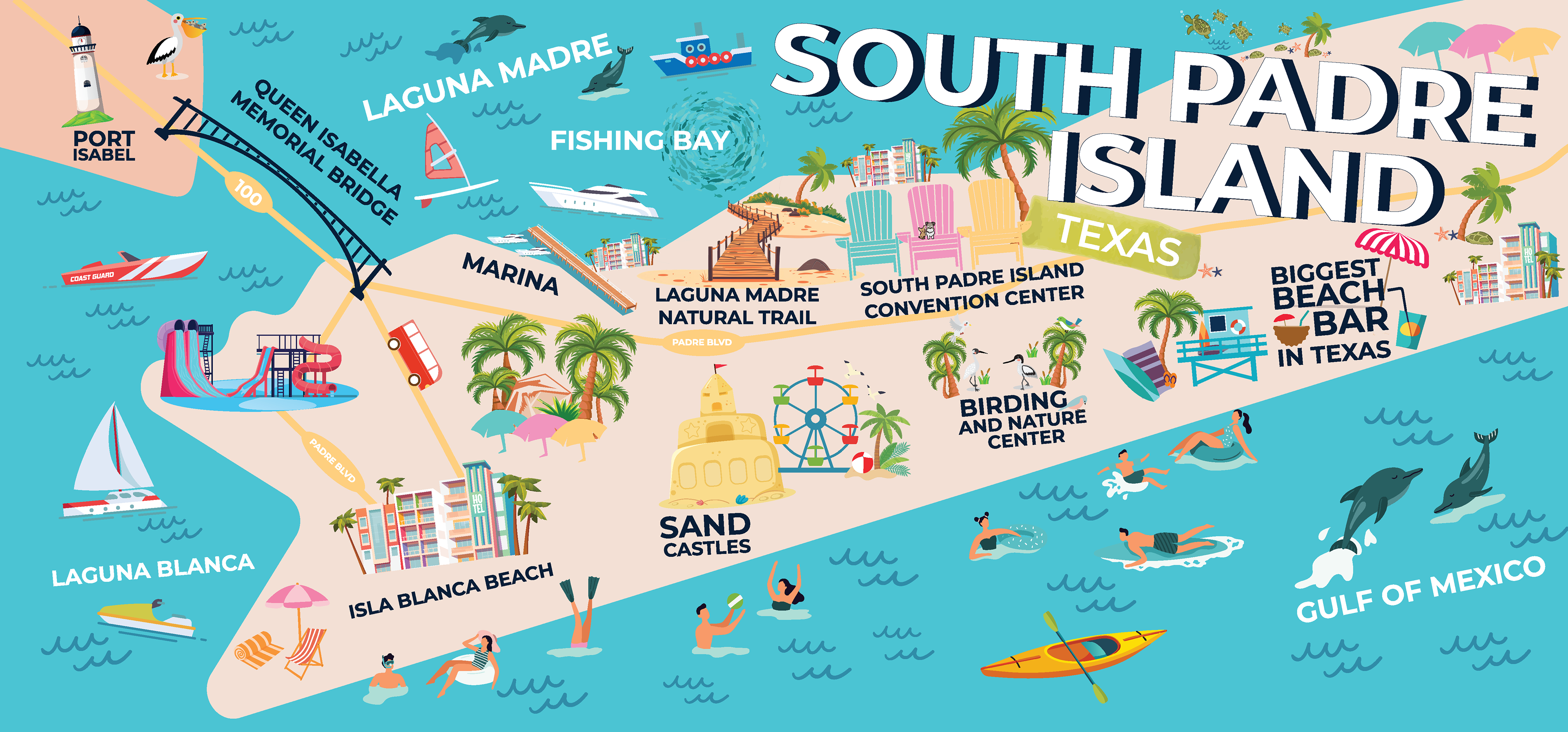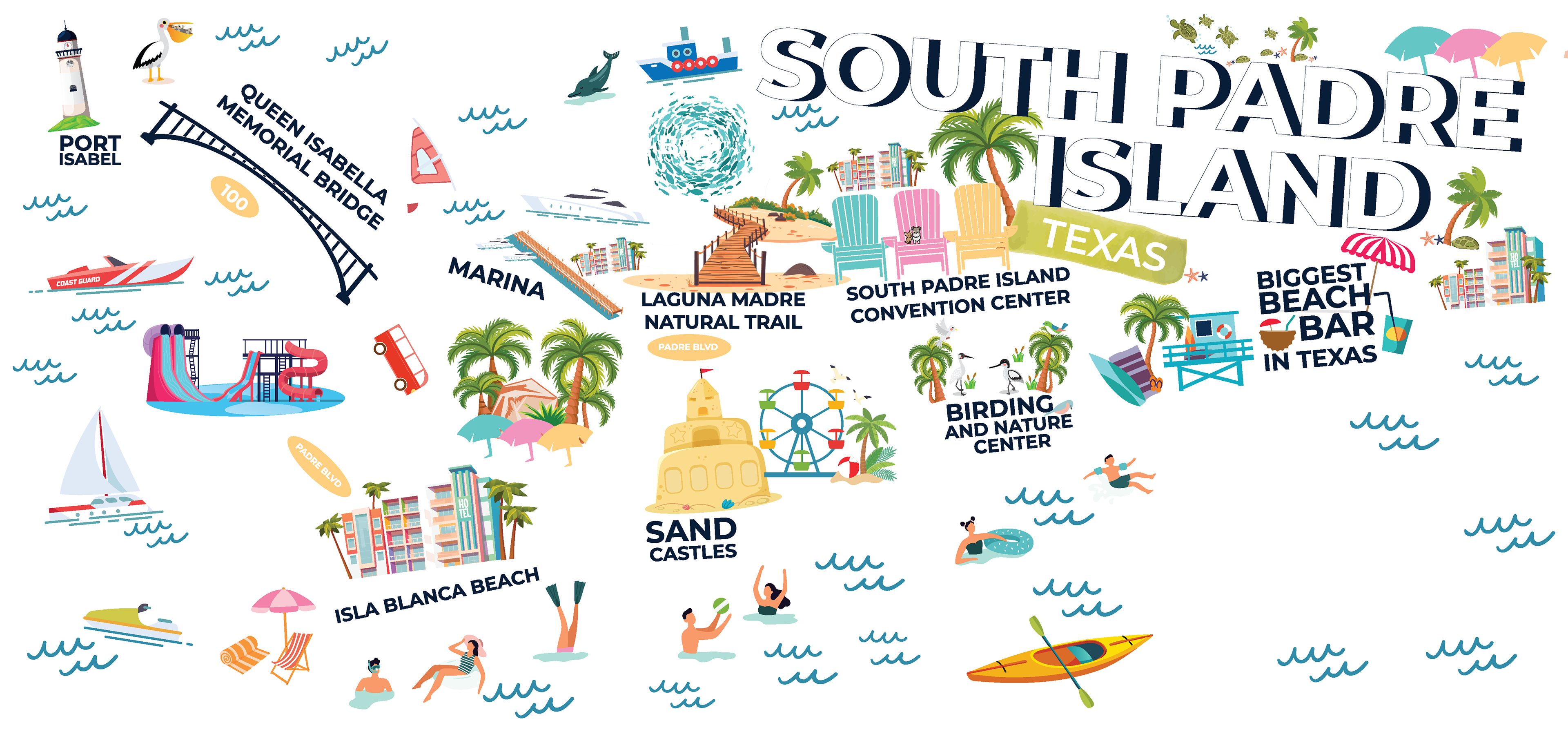 The first mural highlights Brownsville, Texas, weaving together cultural districts, historic sites, civic landmarks, and cross-border geography into a clear, legible illustrated map. Following its success, the South Padre Island Tourism Office commissioned a companion mural that extends the visual language to the coast, emphasizing beach culture, marine life, and recreation. Together, the murals function as a unified environmental graphic system—connecting city and island through consistent typography, illustration style, and spatial flow.